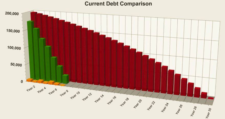 Look at the chart. You’ll notice the green bars dive sharply while the red bars linger HEAP Review for 30-years. The green bars are an example of someone using H.E.A.P.™ to pay off the debt on a home in less than 9 years and the maroon bars line indicate what people typically do which is to pay off their mortgage in 30 years.